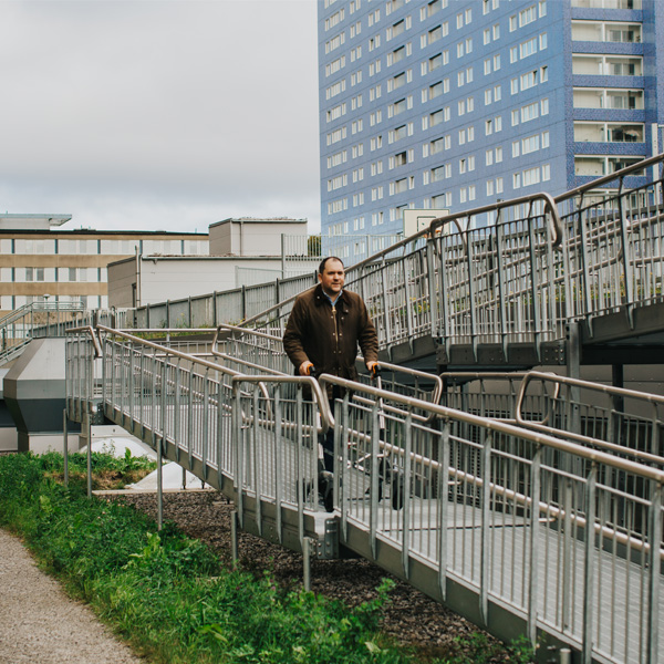 Kronprinsenin pilvenpiirtäjän korotettu sisäpiha ulottuu osittain korttelin yli ja on täysin esteetön – Welandin noin 90 metrin pituisella invalidirampillilla.