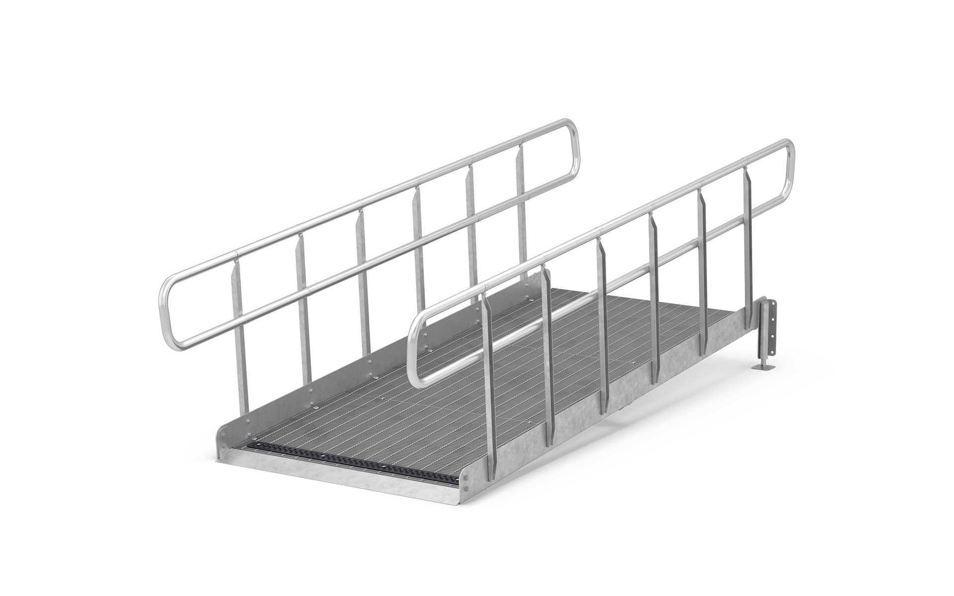 Täydelliset pyörätuoliluiskamme valmistetaan ritilästä ja ne sisältävät kaiteet, sivupalkit ja tarvittavat tukijalat. Ne perustuvat yksinkertaiseen ja tukevaan kuumasinkittyyn teräsrakenteeseen, joka varmistaa vakauden ja kestävyyden. Luiskien kaltevuus on säädettävissä, mutta se saa olla enintään 1:12. Huomiomerkintä sijoitetaan luiskan etureunaan ja tason alkuun. Varastotuotteina saatavat vakiokomponentit takaavat lyhyet toimitusajat. Meillä on myös laaja varastovalikoima 900 mm leveitä luiskia lyhyellä toimitusajalla. Huomiomerkintä sisältyy.