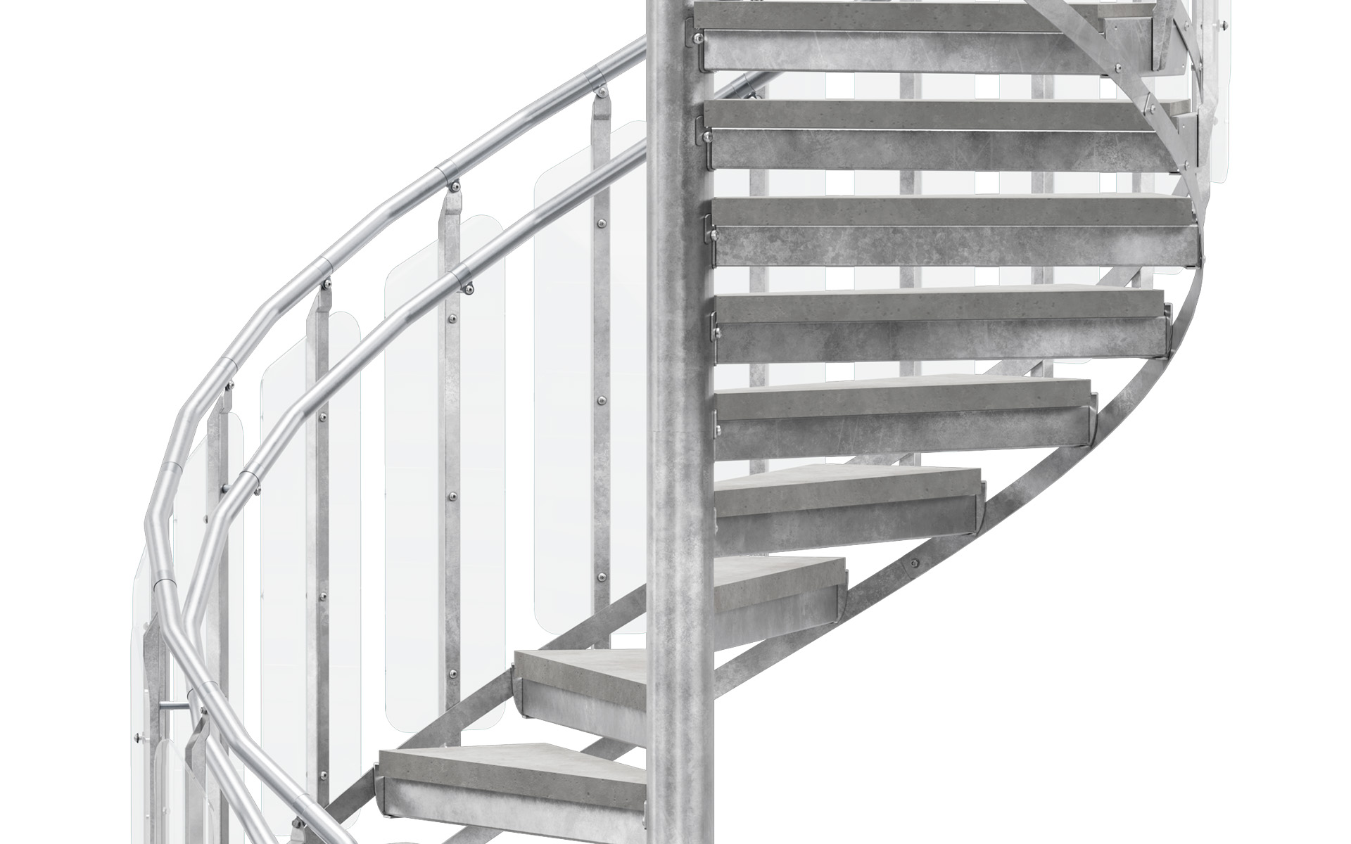 Askelmat harmaasta betonista. Paksuus 50 mm. Toimitetaan askelpinta harjattuna hienoksi, muut sivut sileäksi valettuina. Karkea harjaus, jos portaat ovat ulkona. Betoni lepää levyprofiileista tehdyn alustan päällä.