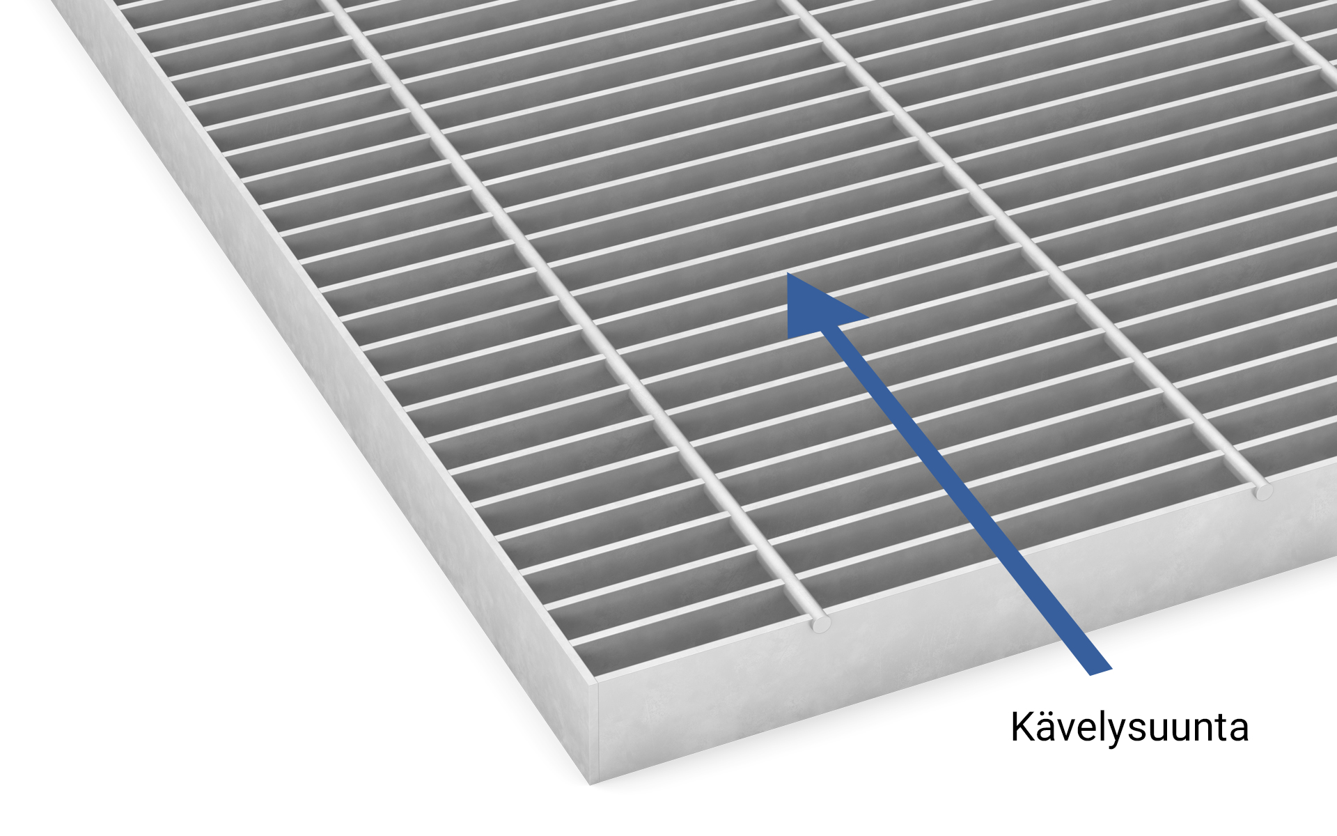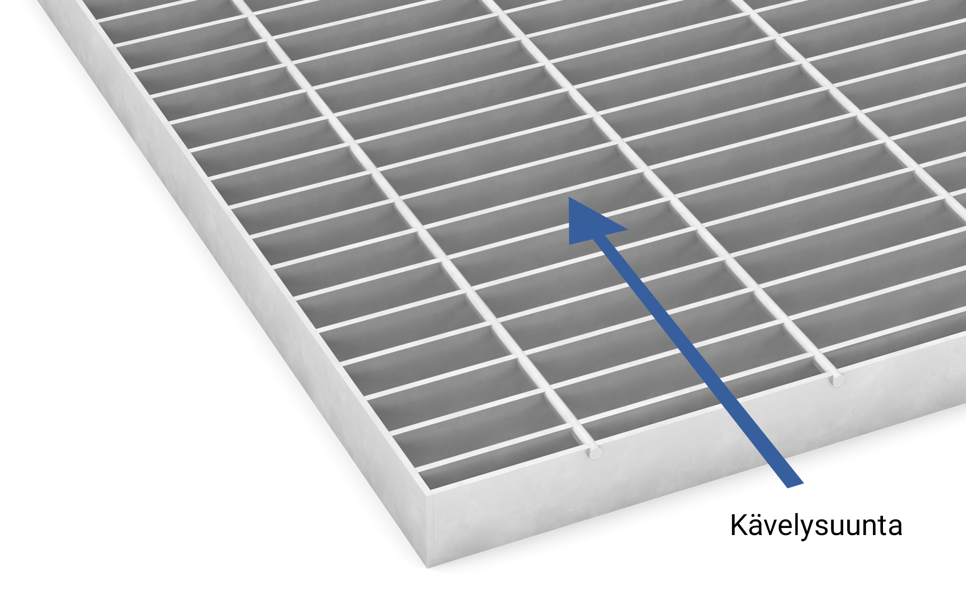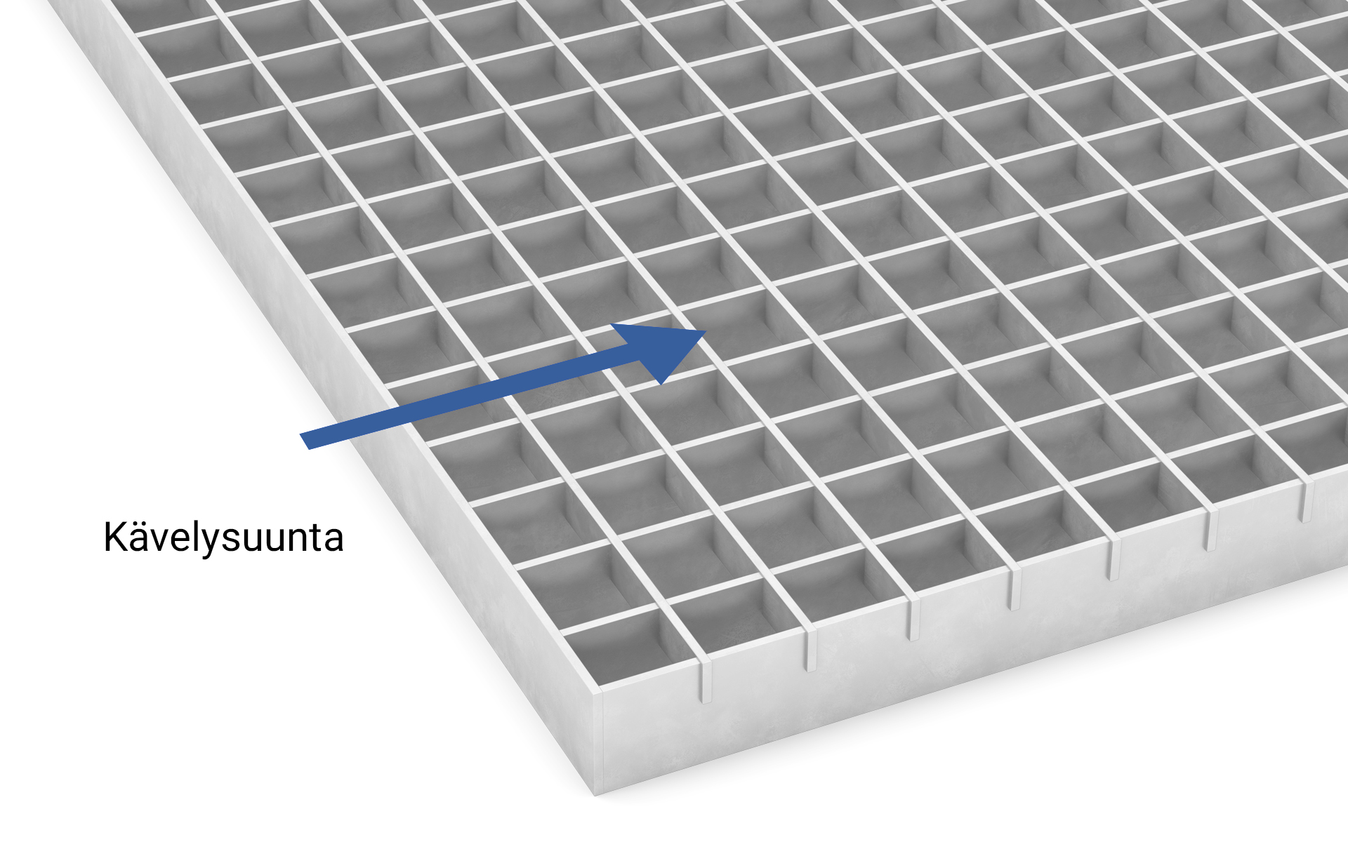 On tärkeä huomioida kävelysuunta kun valitaan ritilävaihtoehto! Ritilämalleilla on eri kantoteräksen suunta. Jos valitset A-Ritilän on kantoteräs kävelysuuntaan kohden, jolloin myös mahdollinen tukirakenne tulee olla kävelysuuntaan. Puristehitsatuissa ritilöissä joissa sideteräs on kantoteräksen pinnalla, kanto on poikittain ja mahdolliset tuennat tarvitaan kulkusuunnan sivuissa. Lisätietoa on saatavilla suunnittelu-osiossa.