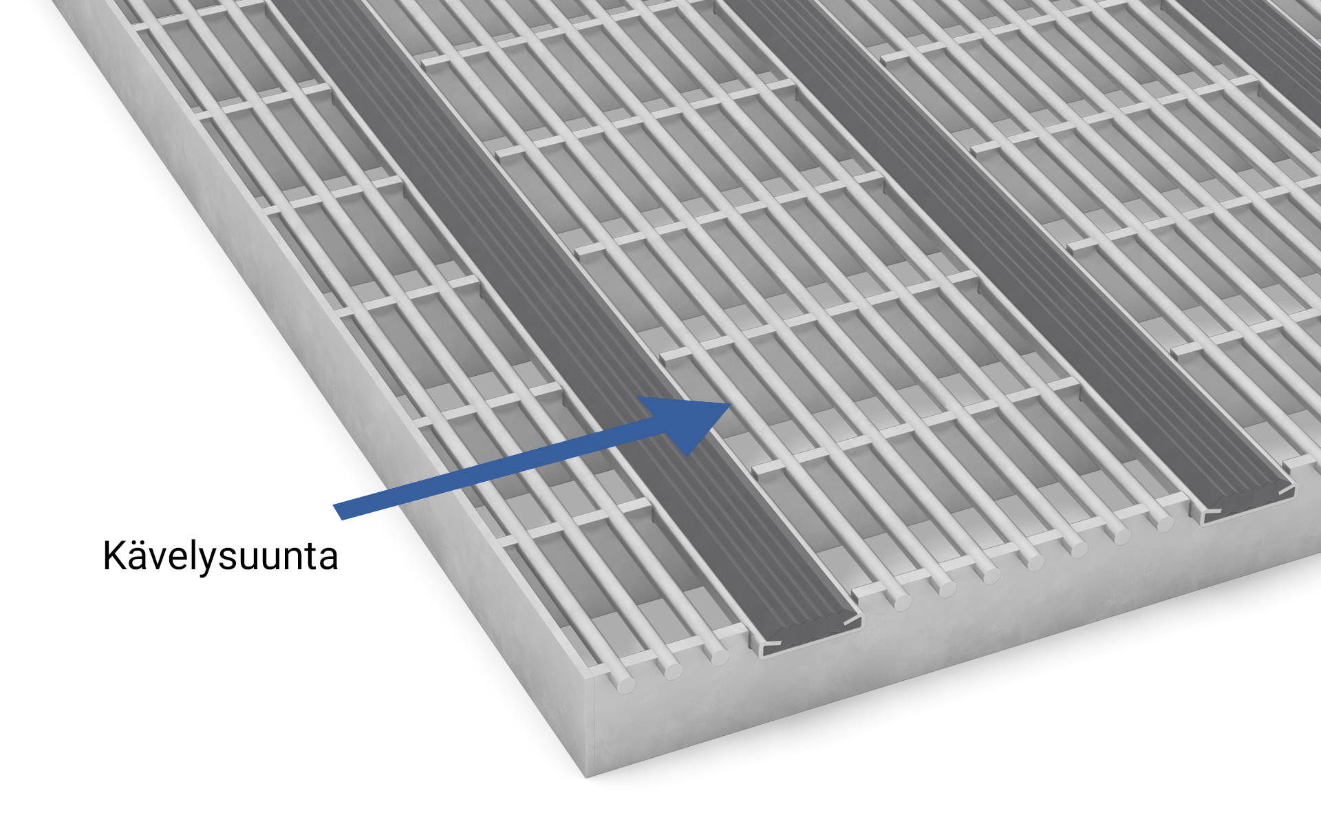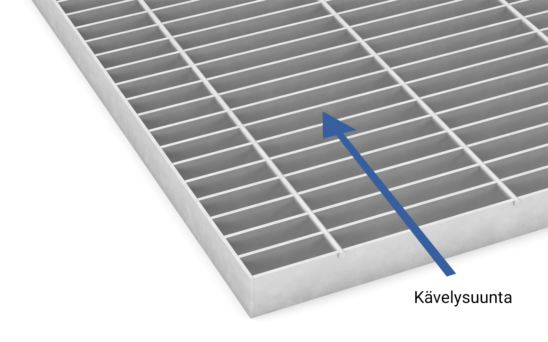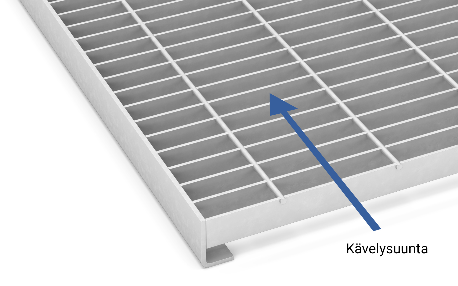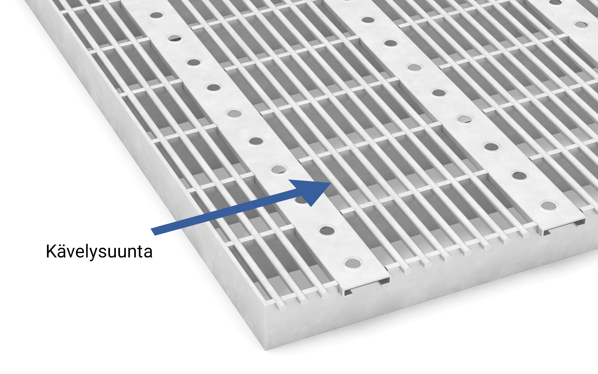 On tärkeä huomioida kävelysuunta kun valitaan ritilävaihtoehto! Ritilämalleilla on eri kantoteräksen suunta. Jos valitset A-Ritilän on kantoteräs kävelysuuntaan kohden, jolloin myös mahdollinen tukirakenne tulee olla kävelysuuntaan. Puristehitsatuissa ritilöissä joissa sideteräs on kantoteräksen pinnalla, kanto on poikittain ja mahdolliset tuennat tarvitaan kulkusuunnan sivuissa. Lisätietoa on saatavilla suunnittelu-osiossa.